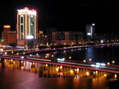每当夜幕降临,两排桥灯和五彩的装饰灯通明透亮,闪烁生辉,宛若两条火龙飞渡浈江,成为古老山城的一道景观。