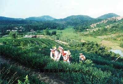 登上高山,极目远眺,长青水库一衣带水,碧绿如墨,湖光山色尽收眼底,夕阳西下,薄雾缭绕,湖水随风荡漾,波光粼粼,飞霞焕彩,一群小鸟掠过湖面,发出一阵阵欢快叫声。青山绿水相辉映,人文风俗更生辉,可谓“山青水碧云作裳,草丰木华鸟鸣幽”。爬上山顶凉亭,举目远眺,层层茶带连绵起伏,一望无际,落日余辉洒在这片茶园里,洒在采茶姑娘娇美的身上;采茶姑娘那甜美山歌传遍整个茶园,久久回荡在那寂静的山中。都市人来到这里,可以访问风俗,探仙山胜境,寻仙人足迹,饮清甜仙泉,品茗皇香茶,呼吸清新空气,令人流连忘返。