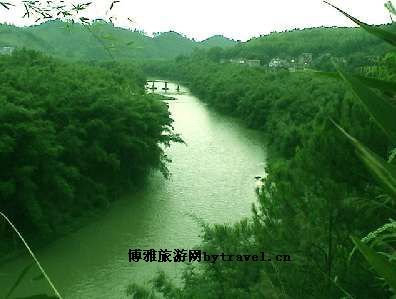 河两岸翠竹遮天蔽日,满目翠绿;河流弯弯,流水潺潺。上游险滩深潭相连,九曲回肠,山在水中,水流山中,山映明镜,河水清澈见底,没有一点污染,完全是原始状态。下游水面平静,两岸翠竹胜似垂柳,婀娜多姿,岸边绿色田园,炊烟渺渺,犹如听见一个苍劲的声音从远古的空中飘来“两岸猿声啼不住,轻舟已过万重山”,这里有山有水,有平湖险滩,有田园,有村庄,这里的清澈无污染的古水河,两岸翠竹、清新的空气、幽静的环境、自然的山水、自然纯朴的乡村居民和田野,突出“绿、清、凉、静、幽、野”,打造天然氧吧、竹乡滋味、山里野味、农家风味、清水漂流、山沟野趣、美景美味。